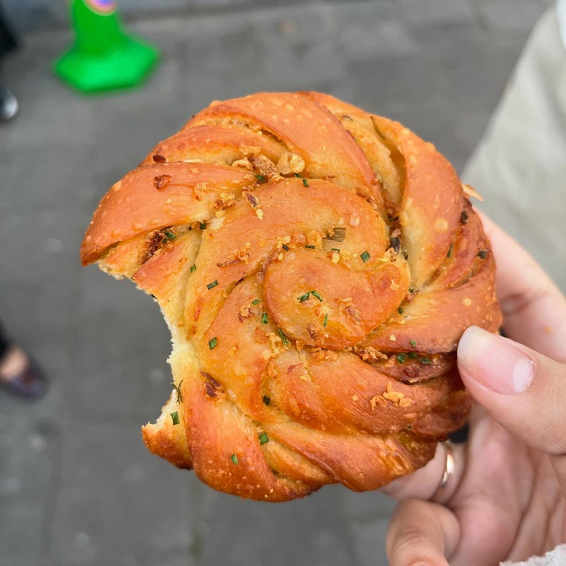I had already walked a lot that day, so I chose something simple. I picked up a garlic bread roll that looked like a golden swirl of comfort. The buttery scent wrapped around me the moment I opened the bag. It was warm and rich, with just enough sharpness to make my mouth water. The first bite gave a soft crunch, and inside, the bread was tender and airy. Each twist of dough was coated in garlic butter and sprinkled with crispy flakes and chives that clung to my fingers. It didn’t just taste good. It tasted like relief.