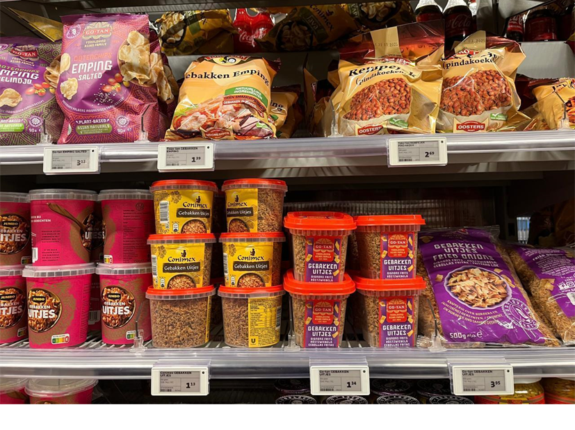 There were rows of small red and yellow containers filled with golden brown flakes. The smell was soft but familiar. It reminded me of the warm taste of home-cooked meals, like when we sprinkled fried onions on top of fried rice. Right above them, we also saw emping, a type of cracker made from melinjo nuts. They are light and crispy, with a slightly bitter taste that many Indonesians love. I picked up a pack and shook it a little. The sound was dry and crunchy, just like how I remembered it back home.